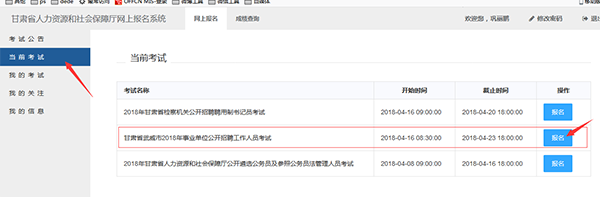 注冊后登錄甘肅省人力資源和社會廳網上報名系統,點擊左上角“當前考試”,點擊“武威市2018年事業單位公開招聘考試”。